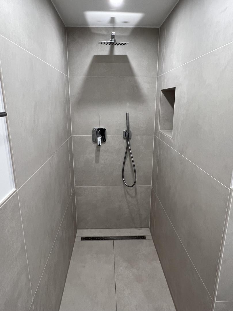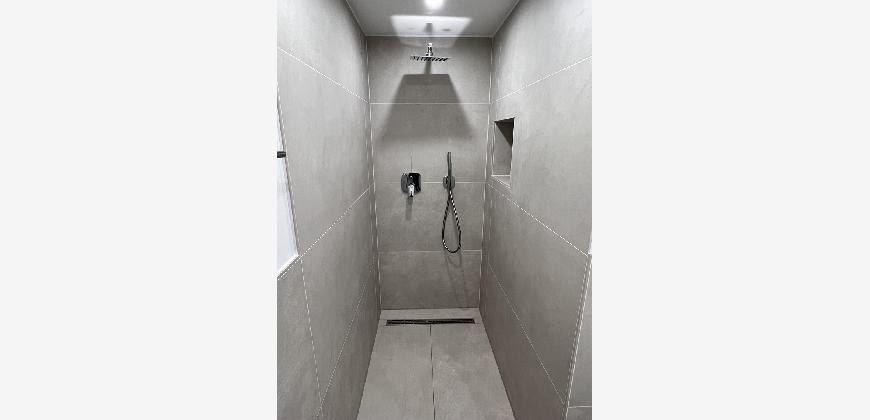 Echtholzparkett, Fliesen und Deckenspots
