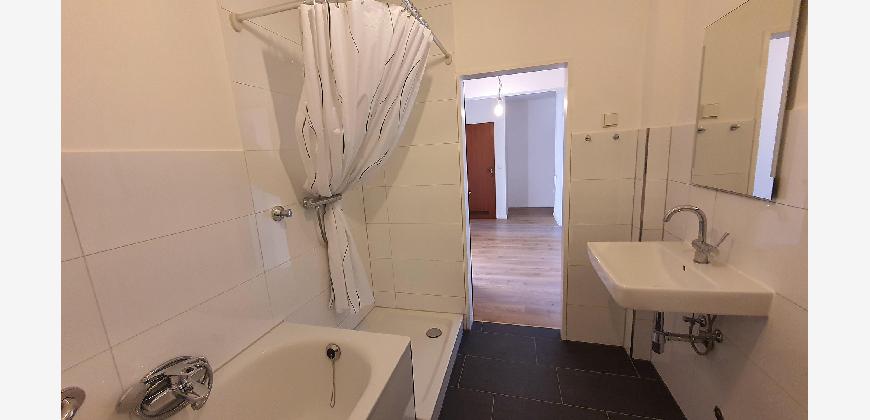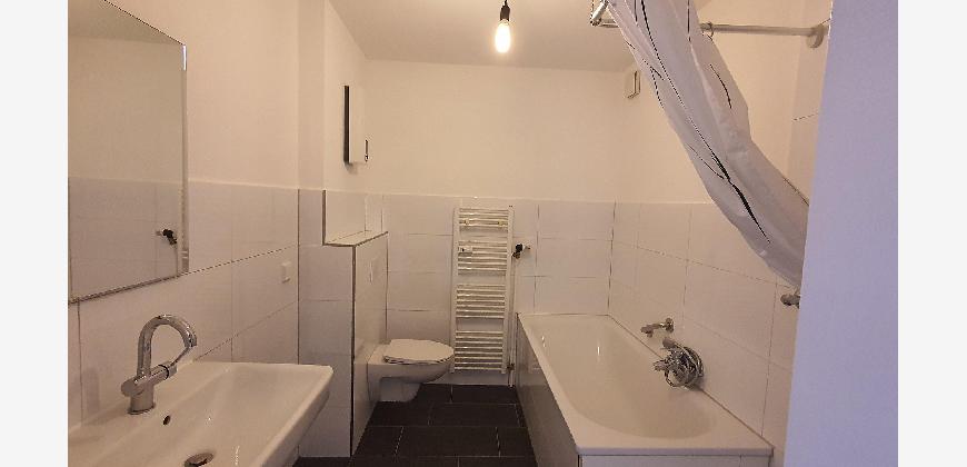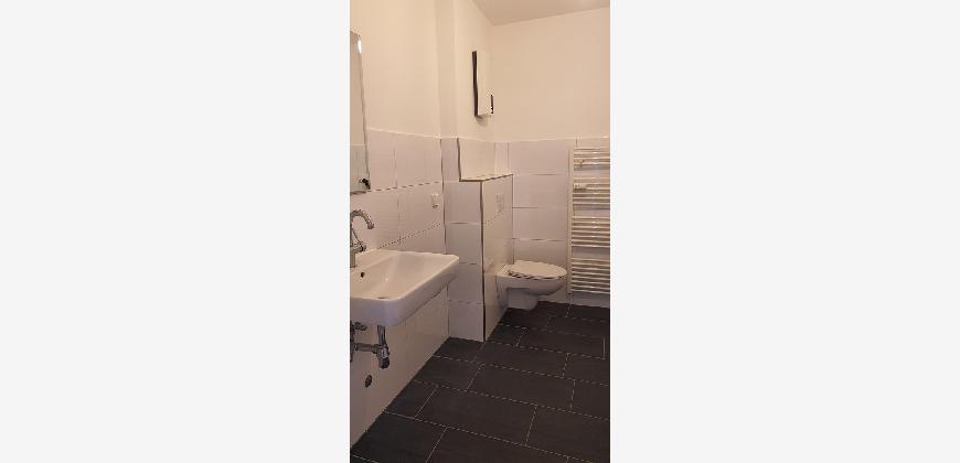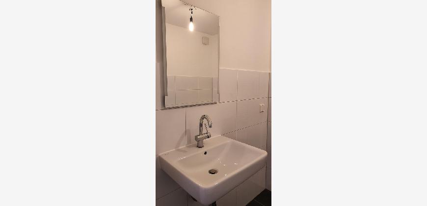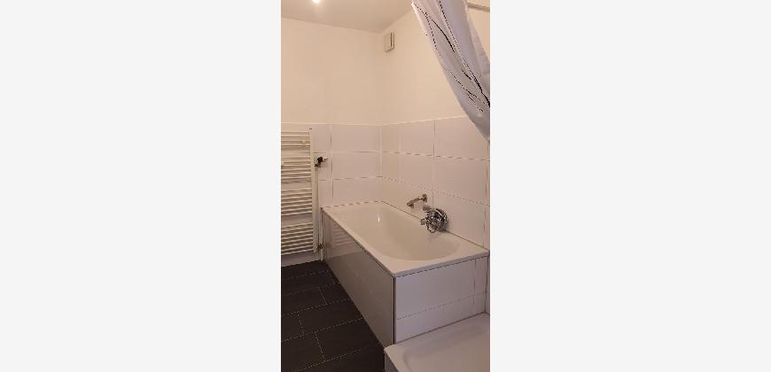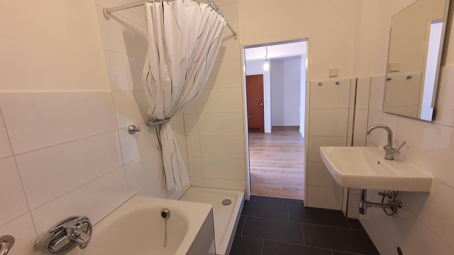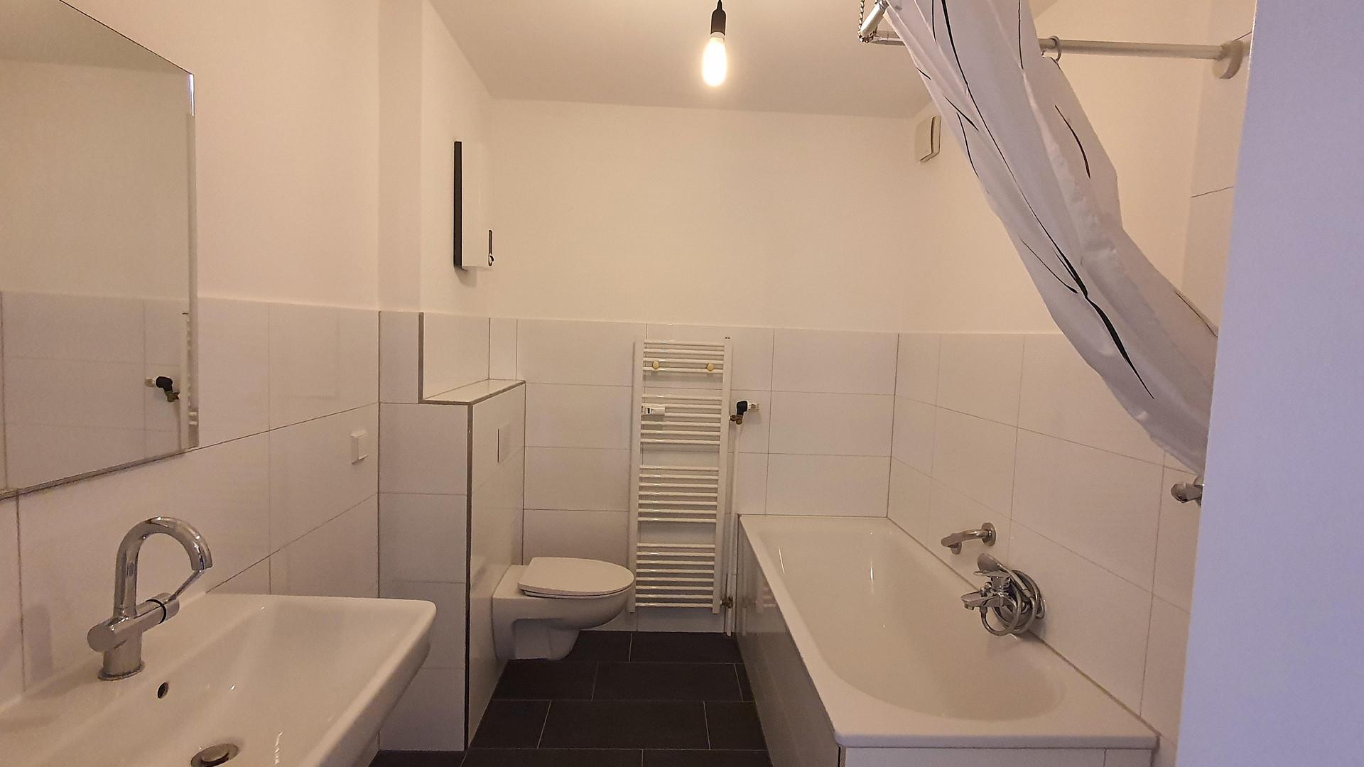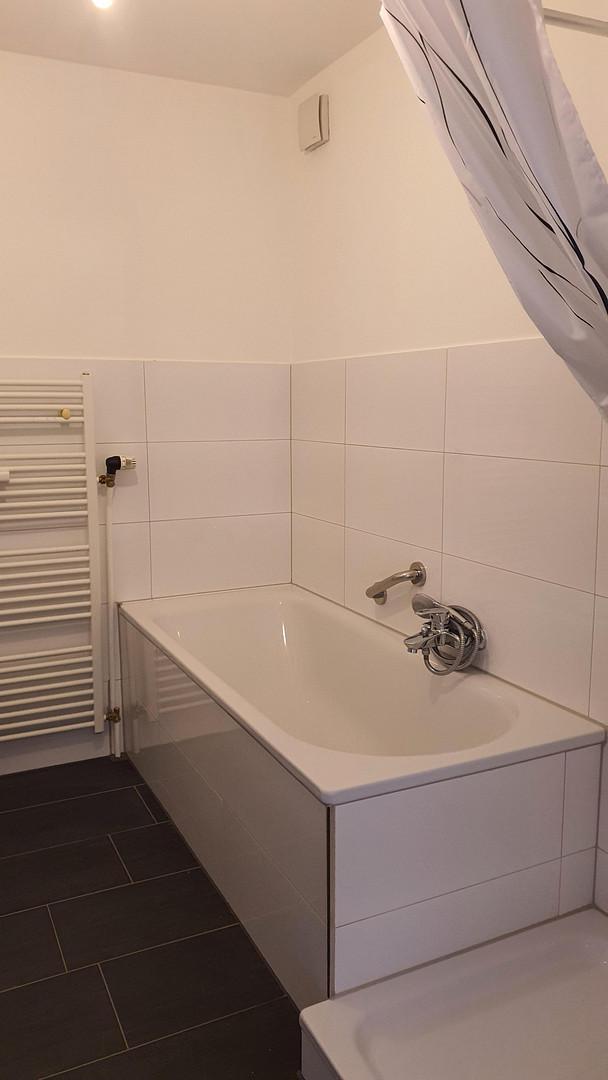 Das neuwertige weiß geflieste Badezimmer mit grauem Bodenbelag ist mit Badewanne und Dusche ausgestattet und verfügt über einen Waschmaschinenanschluss. Alternativ kann die Waschmaschine in der Waschküche (Gemeinschaftsnutzung) mit Trocknungsmöglichkeit im Keller verwendet werden.