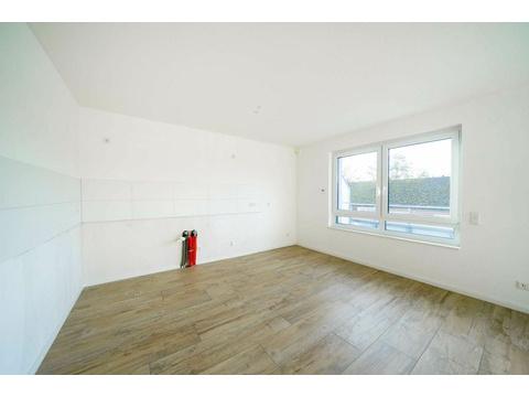 Das Herzstück bildet der großzügige Wohn- und Essbereich mit offener Küche. Durch den offenen Grundriss und die großen Fenster entsteht ein helles, luftiges Raumgefühl – ideal für modernes Wohnen und kommunikatives Beisammensein. Von hier aus gelangen Sie auf die rund 24 m² große Dachterrasse mit Süd-West-Ausrichtung. Hier genießen Sie Sonne bis in die Abendstunden. Die hochwertigen Fliesen in Holzoptik verleihen den Räumen eine warme und elegante Atmosphäre.