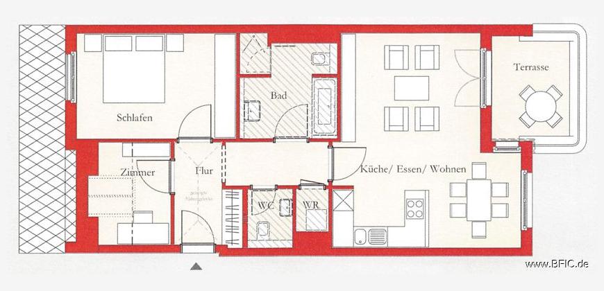 Der großzügige Wohn- und Essbereich mit offener Küche bildet den zentralen Mittelpunkt der Wohnung. Die hochwertige Einbauküche ist mit modernen Geräten ausgestattet und fügt sich harmonisch in das durchdachte Raumkonzept ein. Von hier aus gelangen Sie auf die großzügige Süd-Dachterrasse, die durch ihre Größe nahezu Terrassencharakter besitzt. Sie verfügt über eine Wandlampe, Außensteckdosen sowie einen Wasseranschluss.