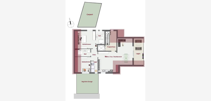 Für jede Wohnung sind ein Carportstellplatz sowie ein weiterer Außenstellplatz vorgesehen.
