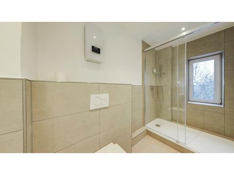 Das Badezimmer wurde komplett neu ausgestattet und bietet eine bodengleiche, begehbare Dusche mit Glasabtrennung, hochwertige Armaturen, ein Fenster für Tageslicht und Belüftung sowie moderne Sanitärkeramik in dezentem Design.