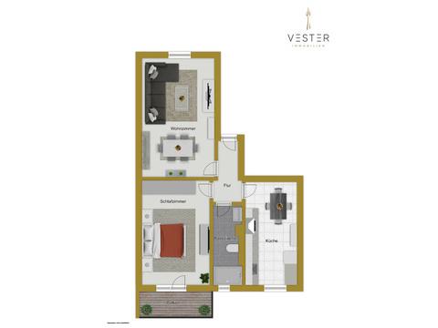 Der durchdachte Grundriss überzeugt durch eine klare Raumaufteilung: Über die zentrale Diele erreichen Sie alle Räume – das Wohnzimmer, das Schlafzimmer, die Küche sowie das Badezimmer.