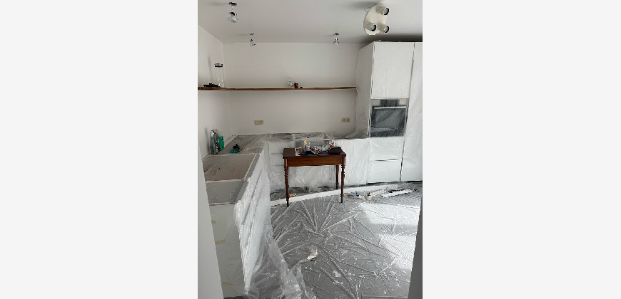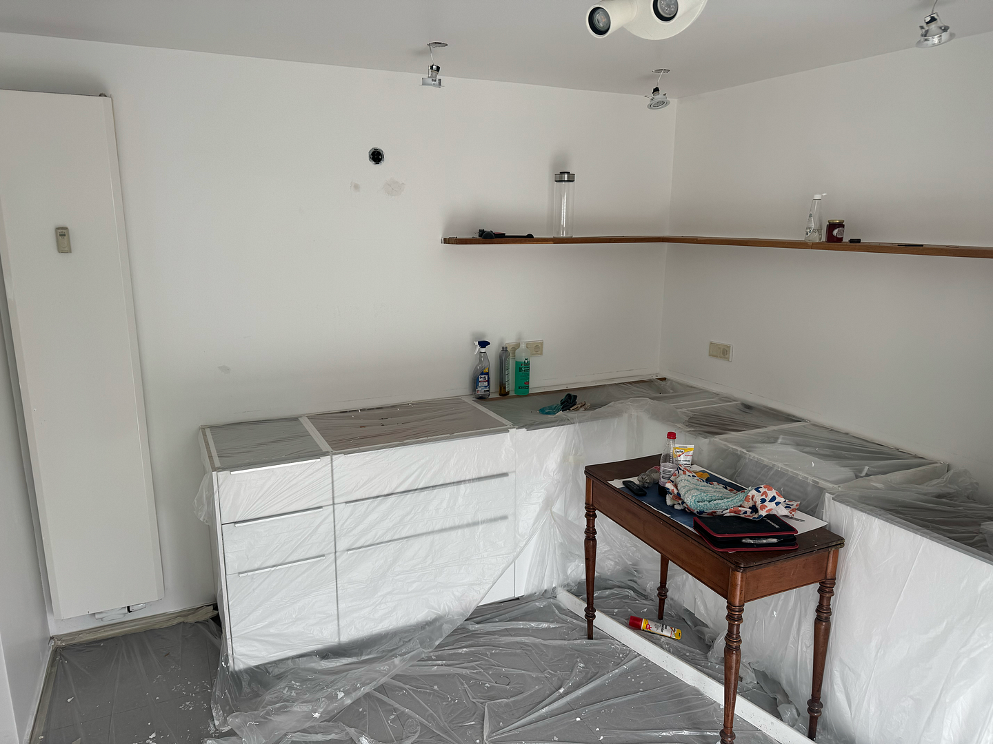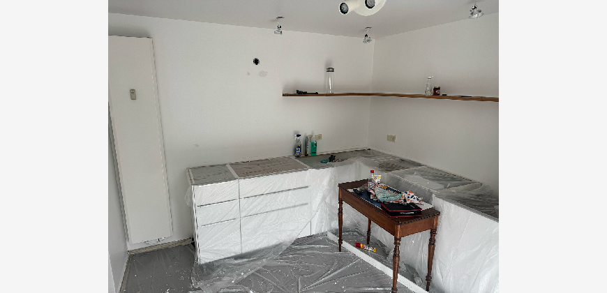 Der helle Wohn- und Schlafbereich wird durch einen neuen, großen Kleiderschrank optisch und funktional in einen gemütlichen Wohnbereich sowie einen separaten Schlafbereich unterteilt. Diese clevere Lösung schafft Struktur und ein angenehmes Raumgefühl.
