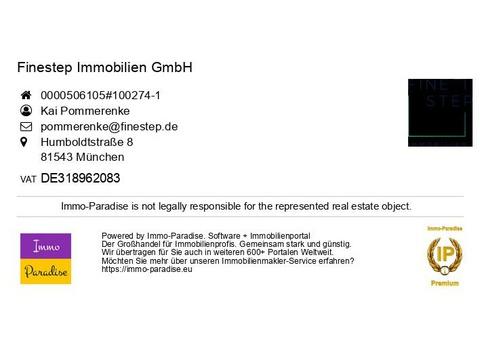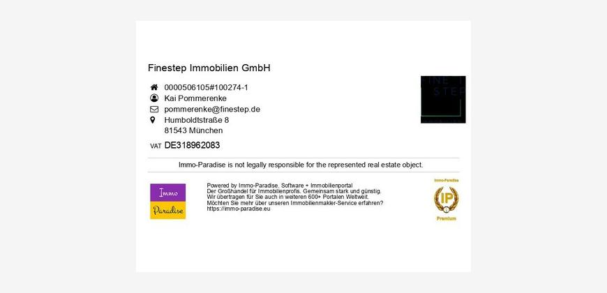 Für die vom Eigentümer übernommenen Objektdaten übernimmt Finestep keine Gewähr in Bezug auf die Vollständigkeit, Richtigkeit und Aktualität dieser Informationen. Irrtum und Zwischenverkauf ist vorbehalten. Die Käuferprovision in Höhe von 3,57% inkl. 19% USt. ist verdient und fällig mit Beurkundung des notariellen Kaufvertrages. Der Immobilienmakler hat einen provisionspflichtigen Maklervertrag mit dem Verkäufer in gleicher Höhe abgeschlossen.