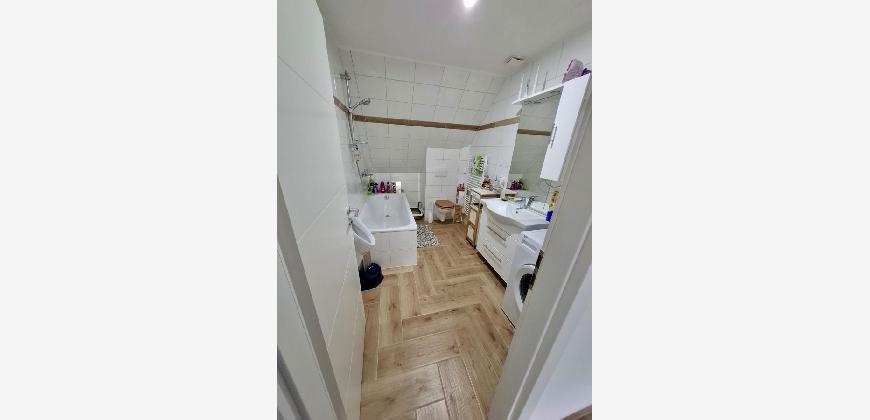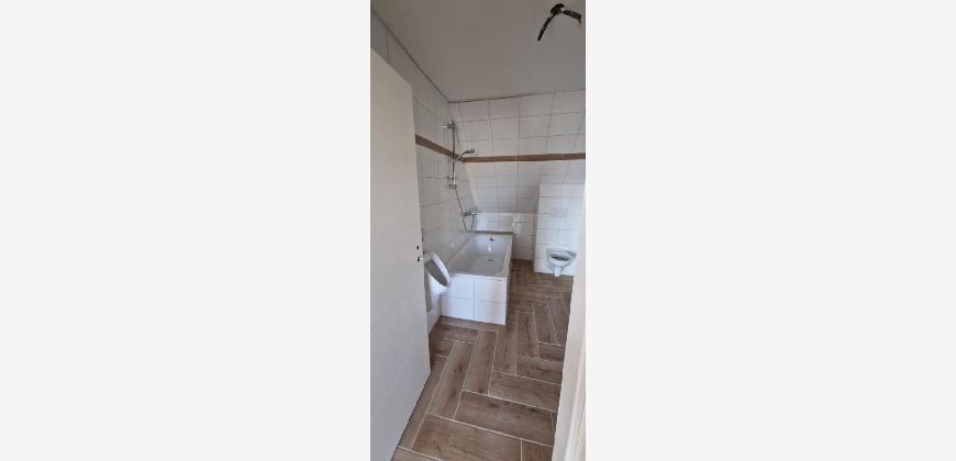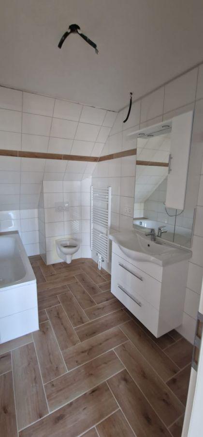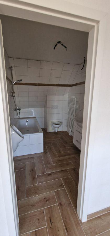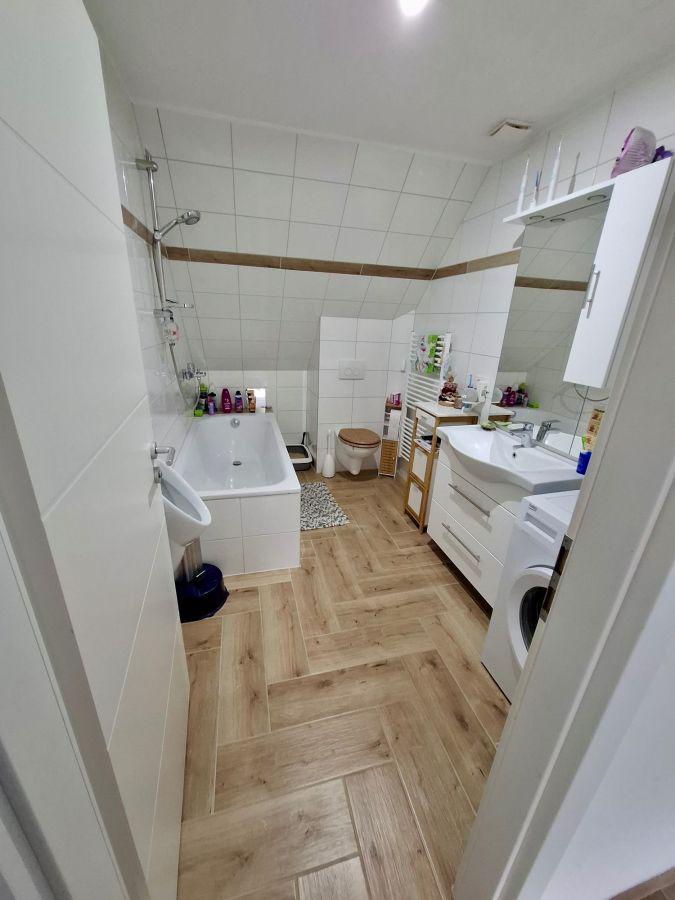Vom Wohnzimmer rechter Hand betreten Sie das Bad mit Toilette, Pissoir, Waschbecken, Badewanne und Waschmaschinenplatz. Das Bad besitzt einen Lüfter.