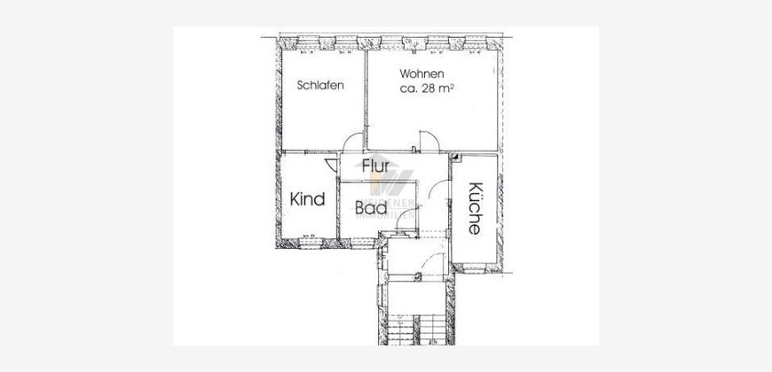 Die Wohnung verfügt über ein Wohn- und 2 Schlafzimmer sowie einer separaten Küche mit Fenster und Einbauküche. Das Bad, ebenfalls mit Fenster, ist mit einer Wanne sowie einem Waschmaschinenanschluss ausgestattet.