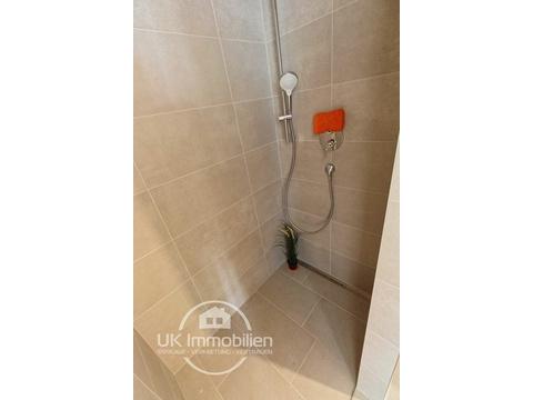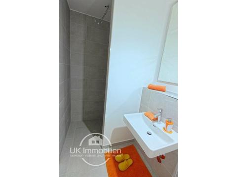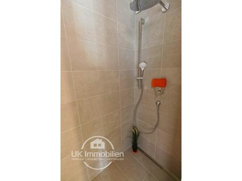 - Bad mit ebenerdiger, gefliester Walk-in Dusche, Rainshower-Duschkopf, XL-Feinsteinzeug-Fliesen, Spiegel