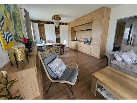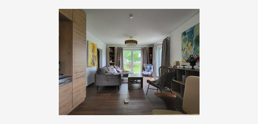 Durch fussbodentiefe Fenster über Eck und ein zusätzliches Doppelfenster ist der 2 große Hauptwohnraum im Erdgeschoss mit integrierter Küche lichtdurchflutet und hat zwei Zugänge zur sonnigen West- und Nordwest- Terrasse.