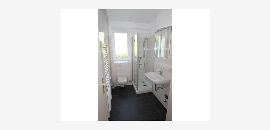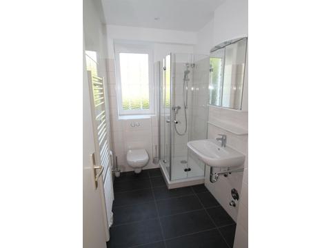 Das helle Tageslichtbad ist mit moderner Duschkabine, Handtuchwärmer und Spiegelschrank ausgestattet. Helle Wandfliesen in Kombination mit einem dunklen Bodenbelag schaffen hier einen eleganten Kontrast.