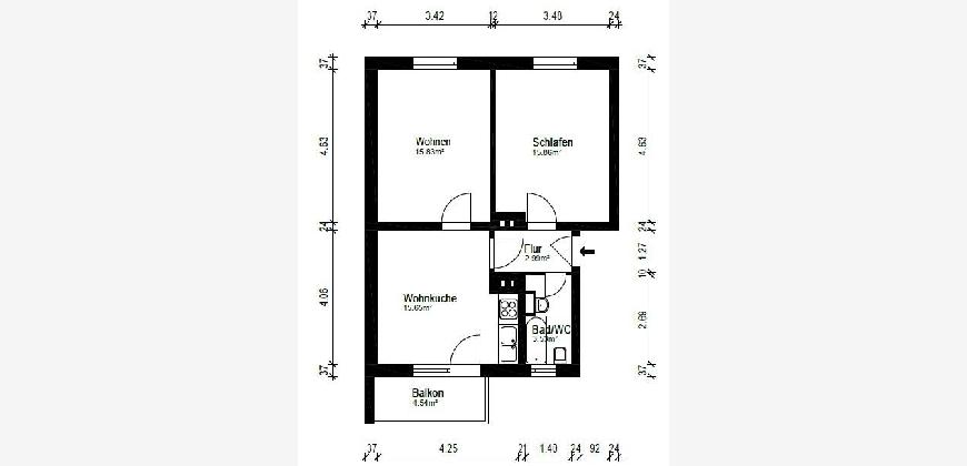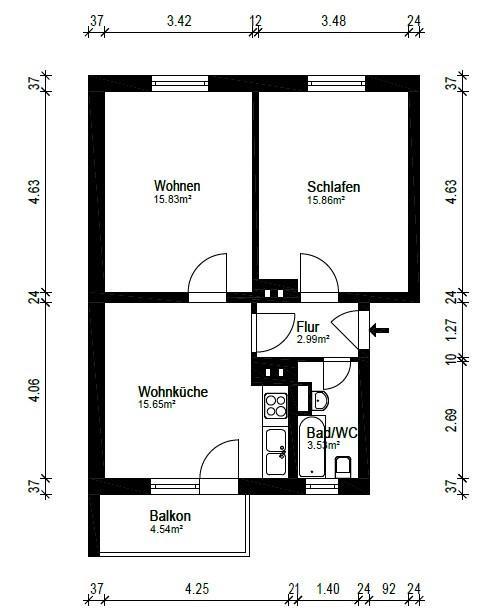 - Wohnküche (15,65 m²): Großzügiger Raum mit neuer, moderner Einbauküche inklusive Geschirrspülmaschine und Induktionsherd (im Mietpreis enthalten). Ideal als Wohn/Essbereich mit Zugang zum Balkon.