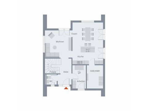 Ein separates Büro im Erdgeschoss bietet den idealen Rückzugsort für konzentriertes Arbeiten - perfekt für Homeoffice oder kreative Projekte. Gäste-WC und Diele sind dezent integriert und unterstreichen die durchdachte Planung.