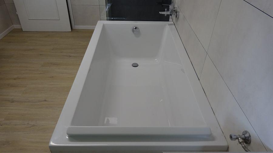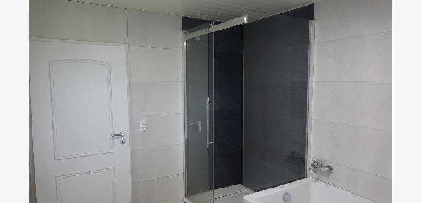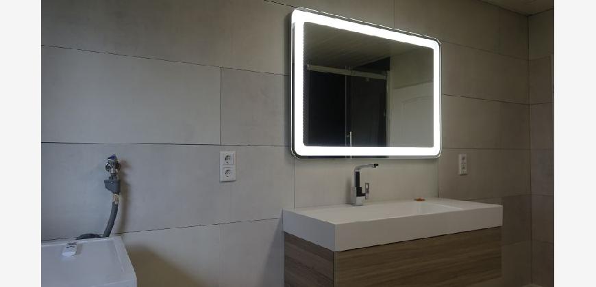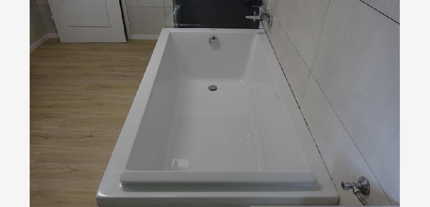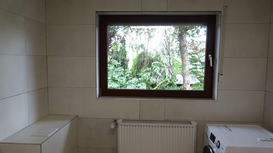 Das komplett sanierte, moderne Badezimmer mit Tageslicht und ca. 11qm hat eine 90cm breite Badewanne und einen großen 140cm Duschbereich sowie sehr großen beleuchteten Spiegel und Anschluss für Waschmaschine.