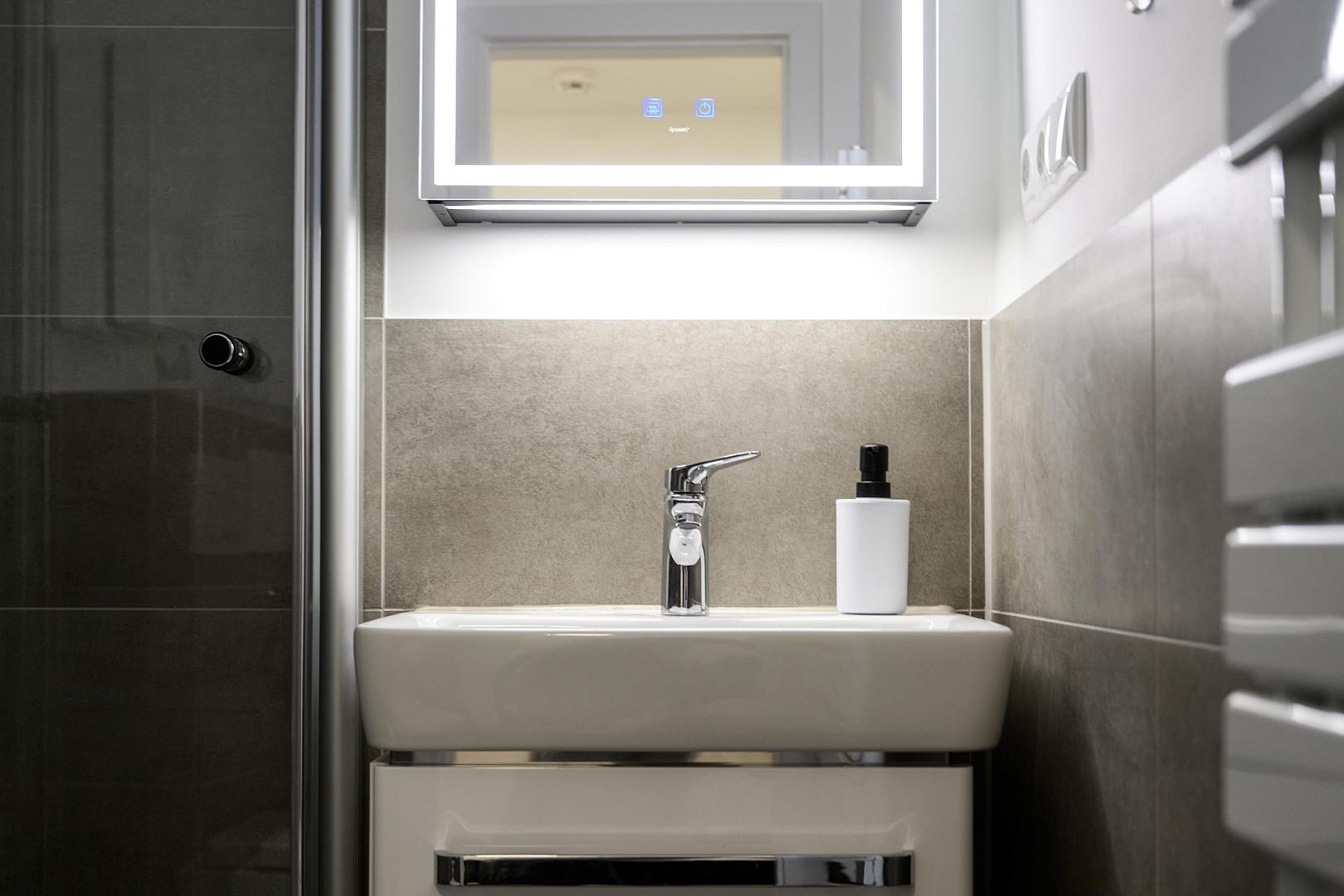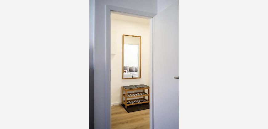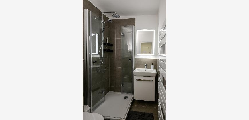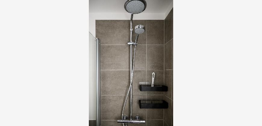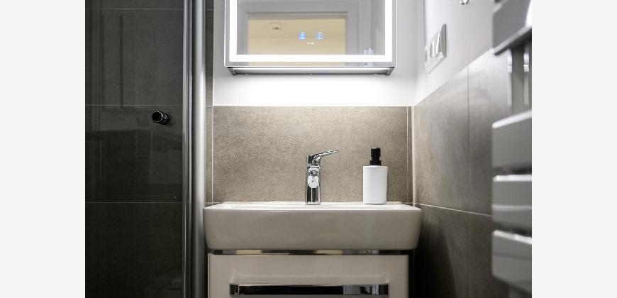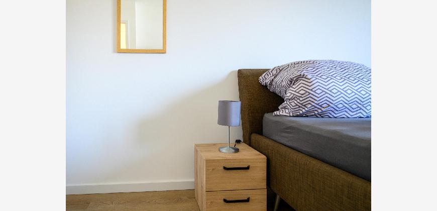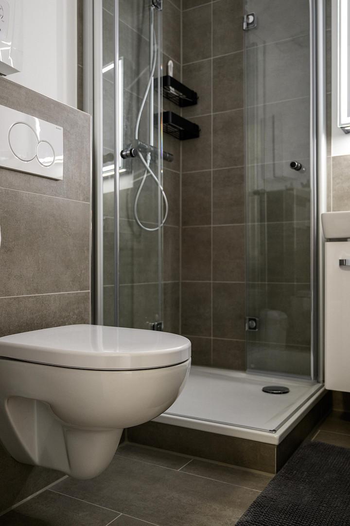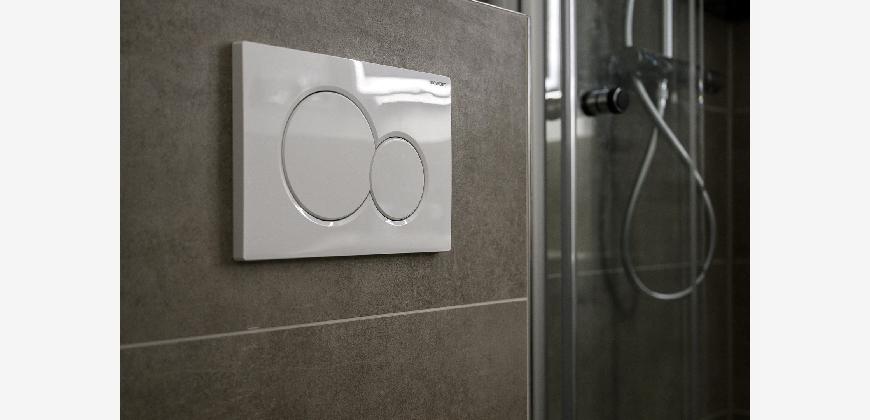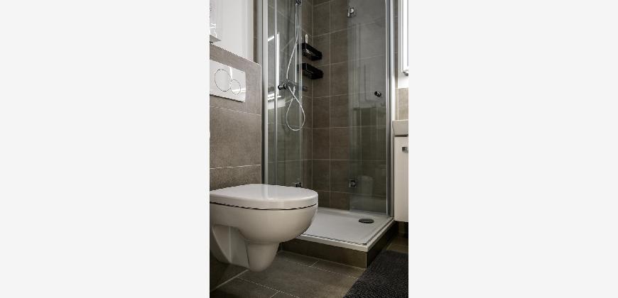 In der gesamten Wohnung, mit Ausnahme des Badezimmers, ist edler und wasserfester Vinylboden in schicker Holzoptik verlegt. Das Badezimmer ist mit neuen Premium-Elementen ausgestattet und beinhaltet eine Dusche, ein WC, einen Waschtisch mit Unterschrank, einen modernen Spiegelschrank mit integrierter Beleuchtung und wird durch die hochwertigen Fliesen in schicker Optik abgerundet.
