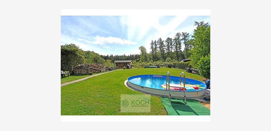 Im Garten steht eine große Terrasse, ein Gartenhaus und ein eingelassener Pool zur Verfügung.