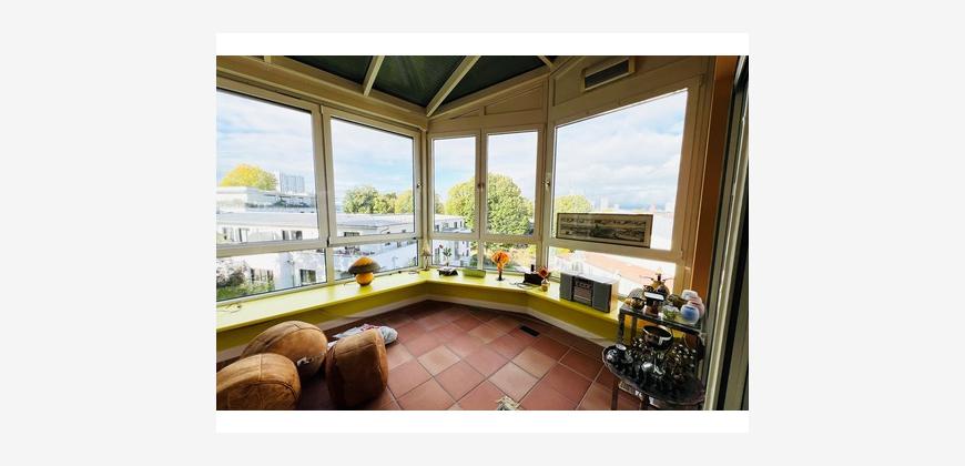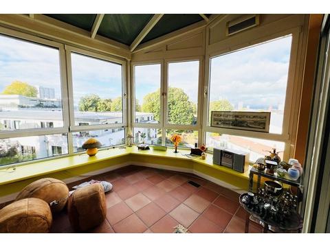 Besonders hervorzuheben sind die beiden ehemals offenen Balkone, die zu zwei großzügigen Wintergärten umgestaltet wurden. Sie schaffen zu jeder Jahreszeit einen angenehmen Rückzugsort mit herrlichem Blick auf die Frankfurter Skyline.