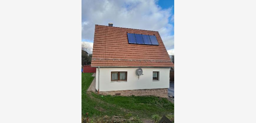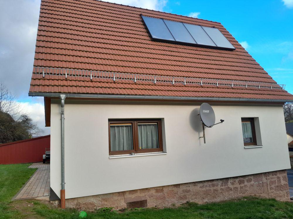 Das Dach wurde ebenfalls komplett neu gerichtet, mit hochwertiger Dämmung (Pavatex) und mir roten Tondachziegel neu eingedeckt. Eine Solaranlage rundet das ganze ab, diese vier Module speisen direkt in die neue Heizungsanlage mit 28 KW und 3 x 800 Ltr. Pufferspeicher im Keller. Der Holzofen kann wahlweise mit langem Scheitholz, oder völlig autark mit Pellets betrieben werden bei längerer Abwesenheit. Brennholz ist reichlich vorhanden und kann mit übernommen werden. Die Anlage ist aus 2021 und arbeitet im Erdgeschoss über Fußbodenheizung, im Dachgeschoss über Heizkörper.