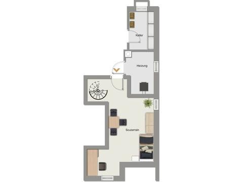 Vielseitigkeit auf zwei Ebenen. Eine Wendeltreppe führt ins Souterrain, wo ein weiteres flexibel nutzbares Zimmer bereitsteht – ideal als Arbeitsbereich, Gäste- oder Kinderzimmer. Von hier gelangen Sie direkt zum eigenen Kellerraum sowie zum gemeinschaftlichen Wasch- und Trockenraum.