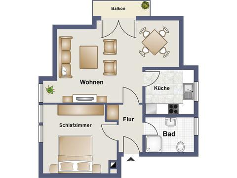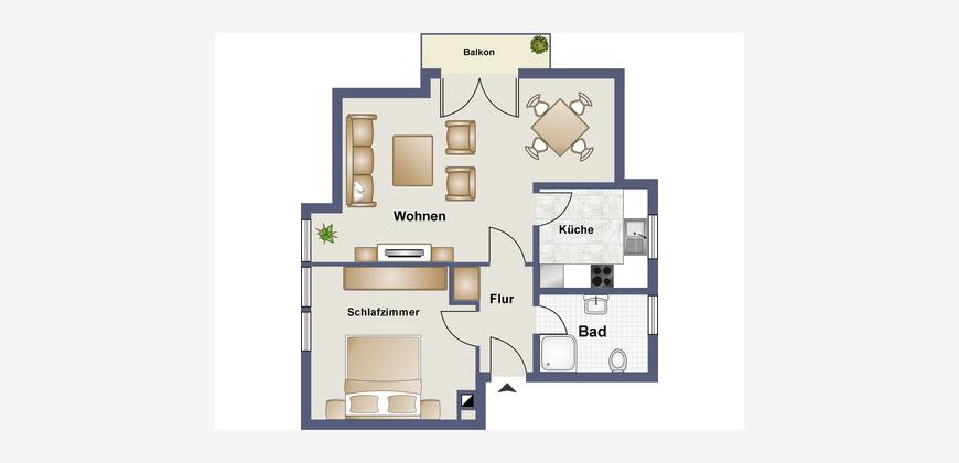 Sehr gut aufgeteilte 2-Zimmerwohnung mit eigenem Balkon in einem ruhigen Mehrfamilienhaus. Aufgeteilt mit Wohn-Esszimmer, Balkon, Küche, Diele, Schlafzimmer, sowie Duschbad mit WC. Zur Wohnung gehört ein eigener Kellerraum, zusätzlich kann der Dachboden als weitere Abstellmöglichkeit genutzt werden. Das Auto stellen Sie auf dem eigenen Stellplatz monatlich € 25,00 ab.
