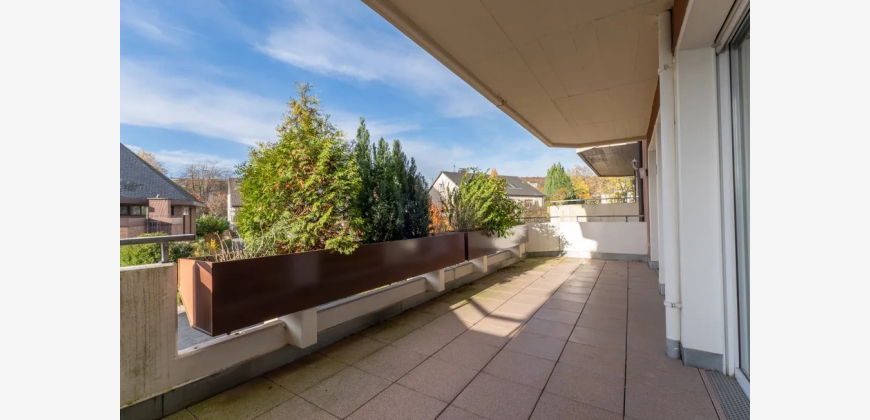 Balkon/Terrasse: Sonniger, großer Balkon, wettergeschützt durch Überdachung, mit zweifachem Zugang, Südwest-Ausrichtung