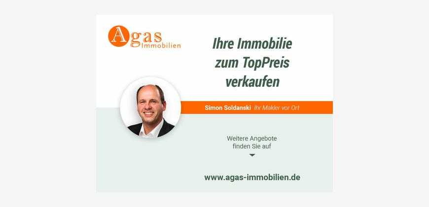 Die Angaben in diesem Angebot beruhen auf Angaben des Auftraggebers oder Dritten. Agas-Immobilien übernimmt keine Haftung und keine Gewähr für die Richtigkeit, Vollständigkeit und Aktualität dieser Angaben. Insbesondere die Angaben zur Wohnfläche, zur Nutzfläche und zur Aufteilung der Wohn-/Nutzfläche sind von uns nicht durch ein eigenes Aufmaß oder eine eigene Wohnflächenberechnung kontrolliert worden. Die Angaben zum Baujahr sind nicht durch eine Einsicht in die Bauakte überprüft worden. Irrtum, Auslassungen und Zwischenverwertung vorbehalten.