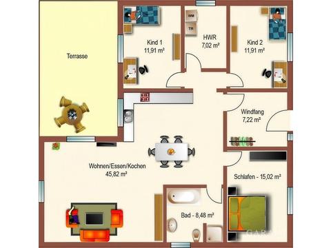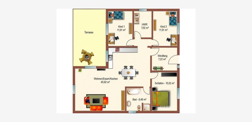 Der Grundriss kann kostenfrei und individuell nach Ihren Wünschen geplant werden, sämtliche TRAGENDE !!! und NICHTTRAGENDE !!! Innenwände können ohne Aufpreis abgeändert werden.