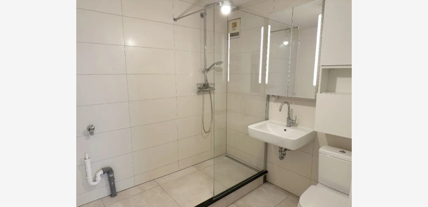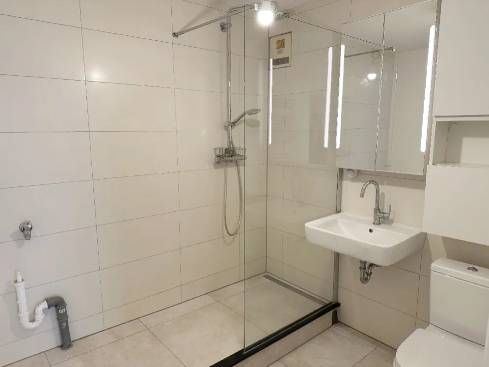 - modernes, weiß gefliestes Duschbad
