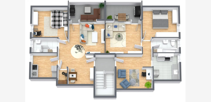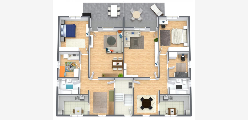 Die Gesamtwohnfläche beträgt ca. 435,33 m² und verteilt sich auf vier 3-Zimmer-Wohnungen sowie zwei 2-Zimmer-Wohnungen. Sämtliche Einheiten verfügen über funktionale Grundrisse mit gut nutzbaren Raumgrößen und sind überwiegend mit Balkonen oder Terrassen ausgestattet. Die beiden Erdgeschosswohnungen bieten jeweils einen direkten Zugang zu Terrassen, während die oberen Wohneinheiten über Balkone verfügen. Die Wohnungen im Dachgeschoss profitieren von einer angenehmen Raumhöhe und einer guten Belichtung.