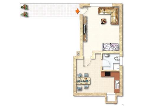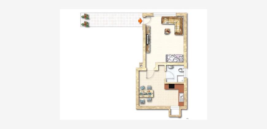 Rund 43 m2 sind verteilt auf einen großzügigen Wohn- und Schlafbereich, 1 Küche und 1 Badezimmer mit Dusche und WC.