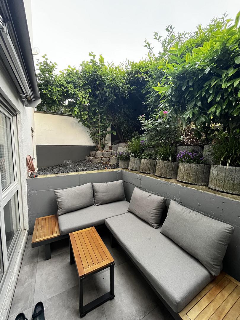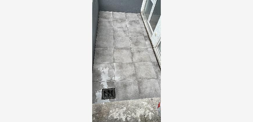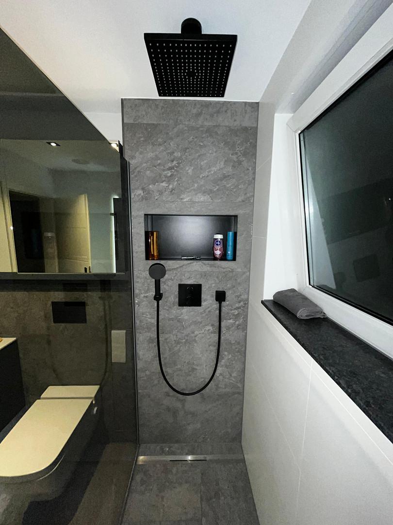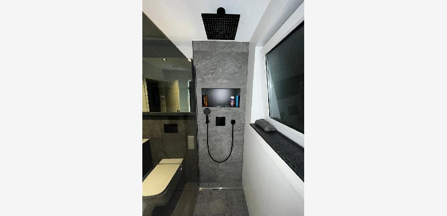 Das Badezimmer wurde deckenhoch gefliest und verfügt über eine bodengleiche Dusche, eingelassene LED-Spots sowie ein integriertes Einbauradio in der Decke – perfekt für einen entspannten Start in den Tag.