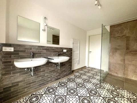 • Großzügiges Badezimmer mit Dusche, Bidet, Doppelwaschbecken und Fenster