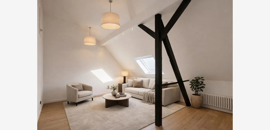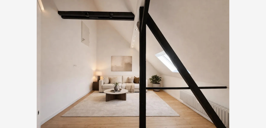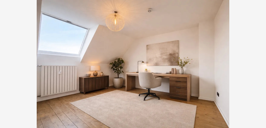 Ein besonderes Highlight ist das ausgebaute Dachgeschoss: sichtbare Balken, hohe Decken und ein großes Dachflächenfenster verleihen dem Raum einen loftartigen Charakter perfekt als Atelier, zusätzliches Schlafzimmer oder individueller Rückzugsort.