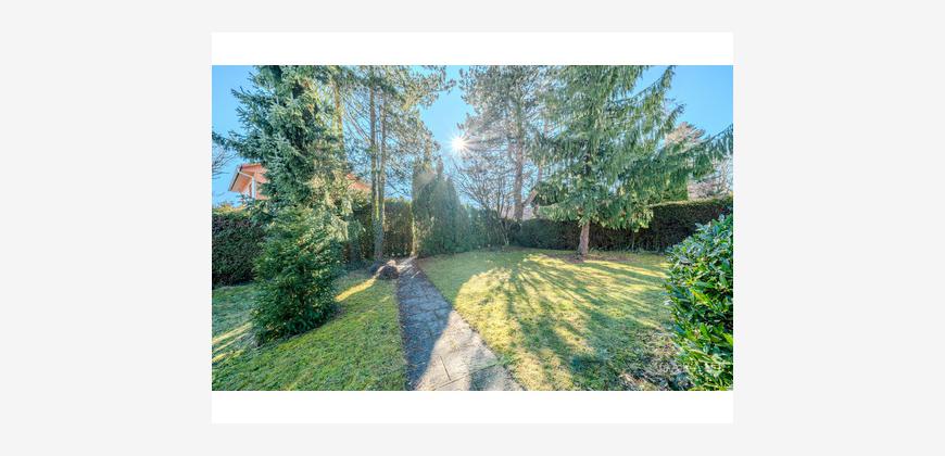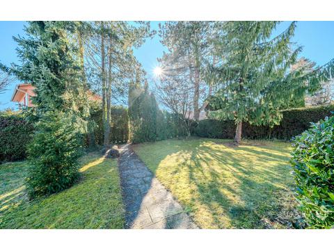 Der Garten präsentiert sich klar strukturiert mit gepflasterten Wegen und Terrassenflächen. Eingewachsene Hecken als natürlicher Sichtschutz sowie gewachsener Baumbestand sorgen für angenehme Privatsphäre und schaffen einen geschützten, ruhigen Außenbereich mit hoher Aufenthaltsqualität.