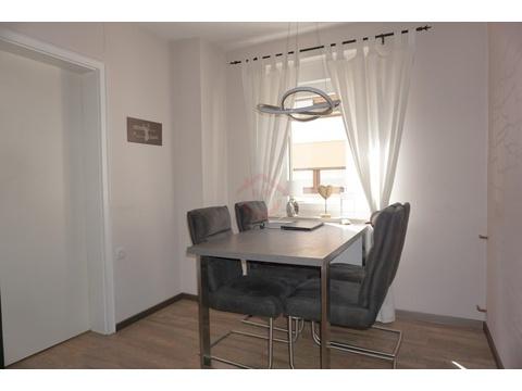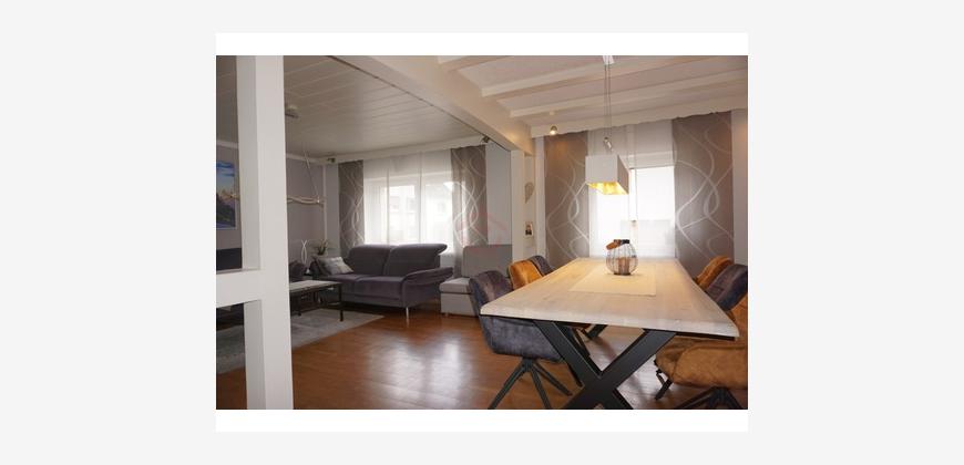 Auf der linken Seite des Anwesens befindet sich das freistehende Einfamilienhaus zur Eigennutzung. Vom abgetrennten Eingangsbereich gelangt man durch eine Zwischentür in das zentral gelegene Treppenhaus. Eine Tür auf der linken Seite führt direkt in das offene Wohnzimmer, welches sich über die gesamte Breite des Gebäudes erstreckt und im hinteren Teil direkt mit dem Esszimmer verbunden ist. Vom Esszimmer wiederum gelangt man zurück in das Treppenhaus. An das Esszimmer offen angrenzend befindet sich die moderne Küche. Zeitgemäß ist die Speisekammer. Ein Tageslicht-Duschbad rundet die Wohnetage ab.