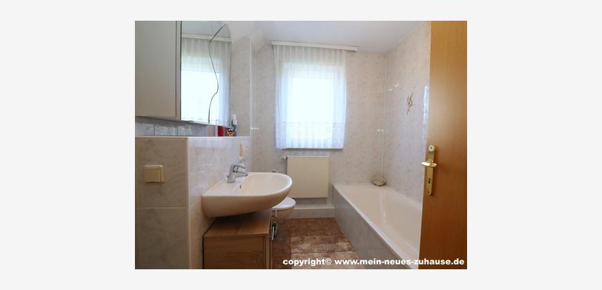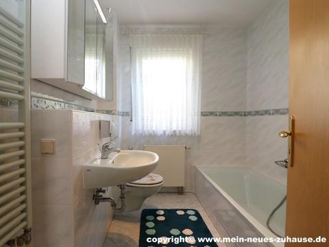 Bad gefliest, Wanne, Dusche, Waschbecken, WC, Handtuchtrockner