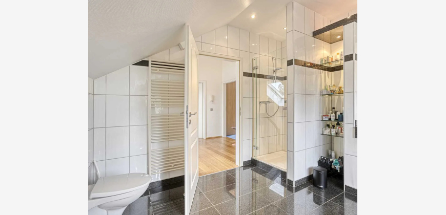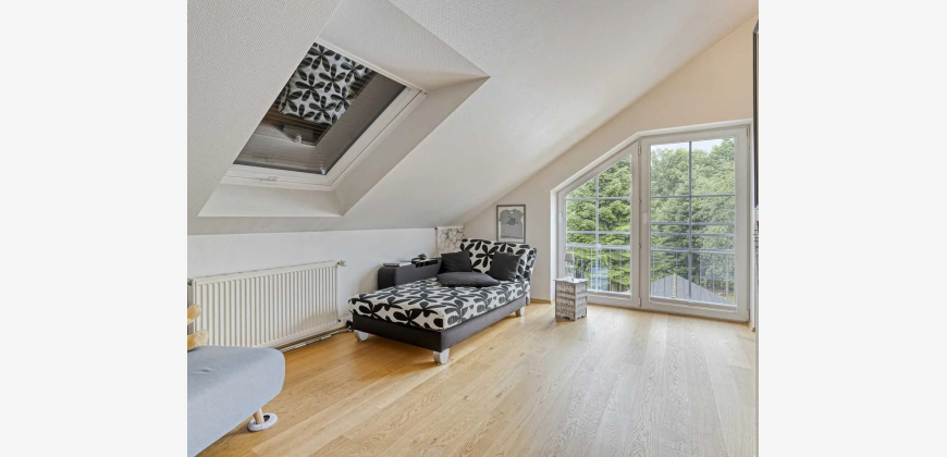 Über eine hochwertige Holztreppe gelangt man ins Dachgeschoss, das mit zusätzlichem Wohnraum überzeugt. Insgesamt stehen hier drei weitere Zimmer zur Verfügung, die sich flexibel nach den individuellen Bedürfnissen nutzen lassen. Das großzügige und stillvoll ausgestattete Tageslichtbadezimmer bietet Ihnen zusätzlichen Komfort.