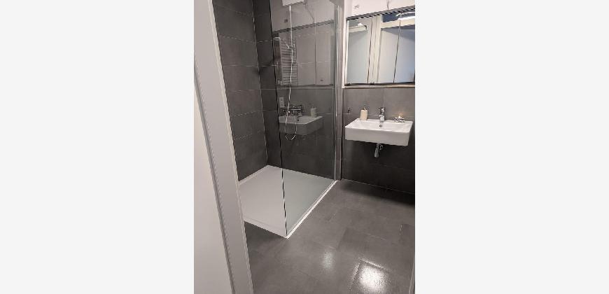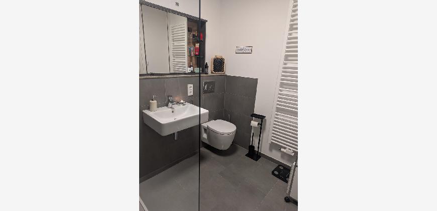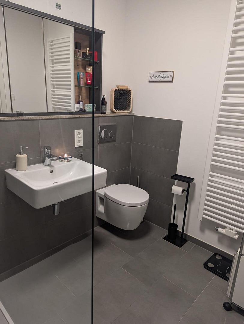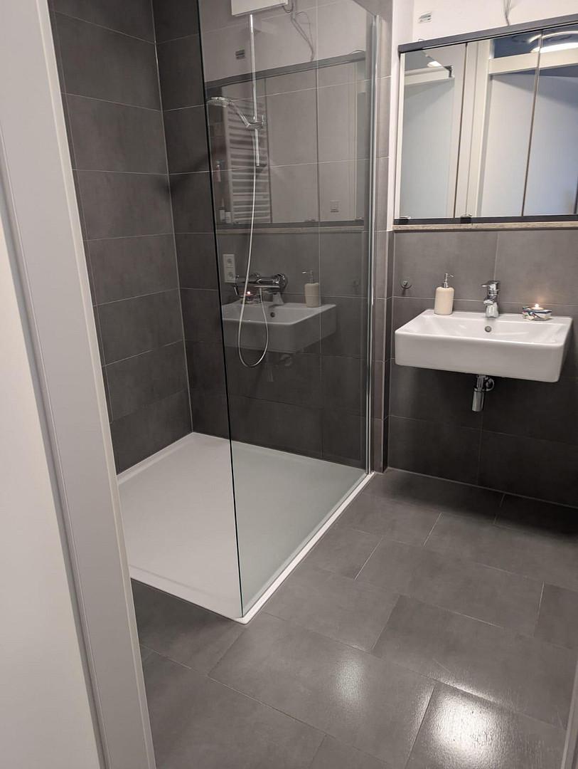 Das Badezimmer verfügt über Wand- und Bodenfliesen in Betonoptik, Natursteinablagen, hochwertige Sanitäranlagen und Armaturen, einen Handtuchheizkörper und eine nahezu bodengleiche Dusche.
