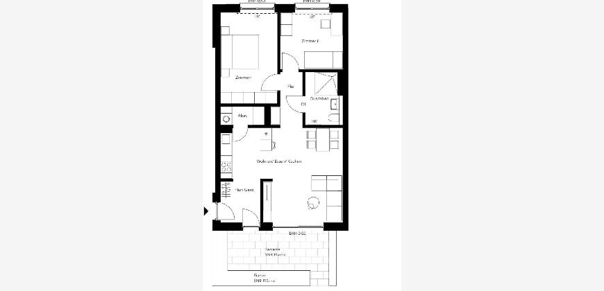 Die Dreizimmerwohnung besticht durch eine moderne durchdachte Zimmeraufteilung: über einen hellen Eingangsbereich mit der Möglichkeit zur Anbringung einer Garderobe betreten Sie den großen Wohn-Essbereich mit offenem Küchenbereich.