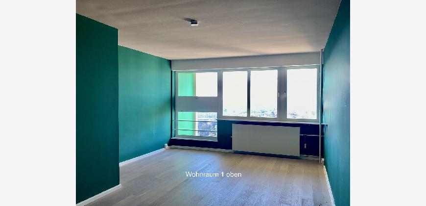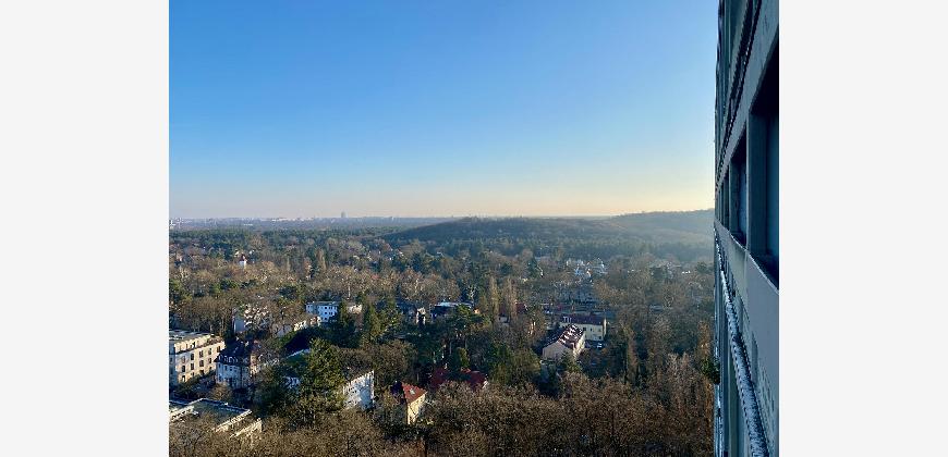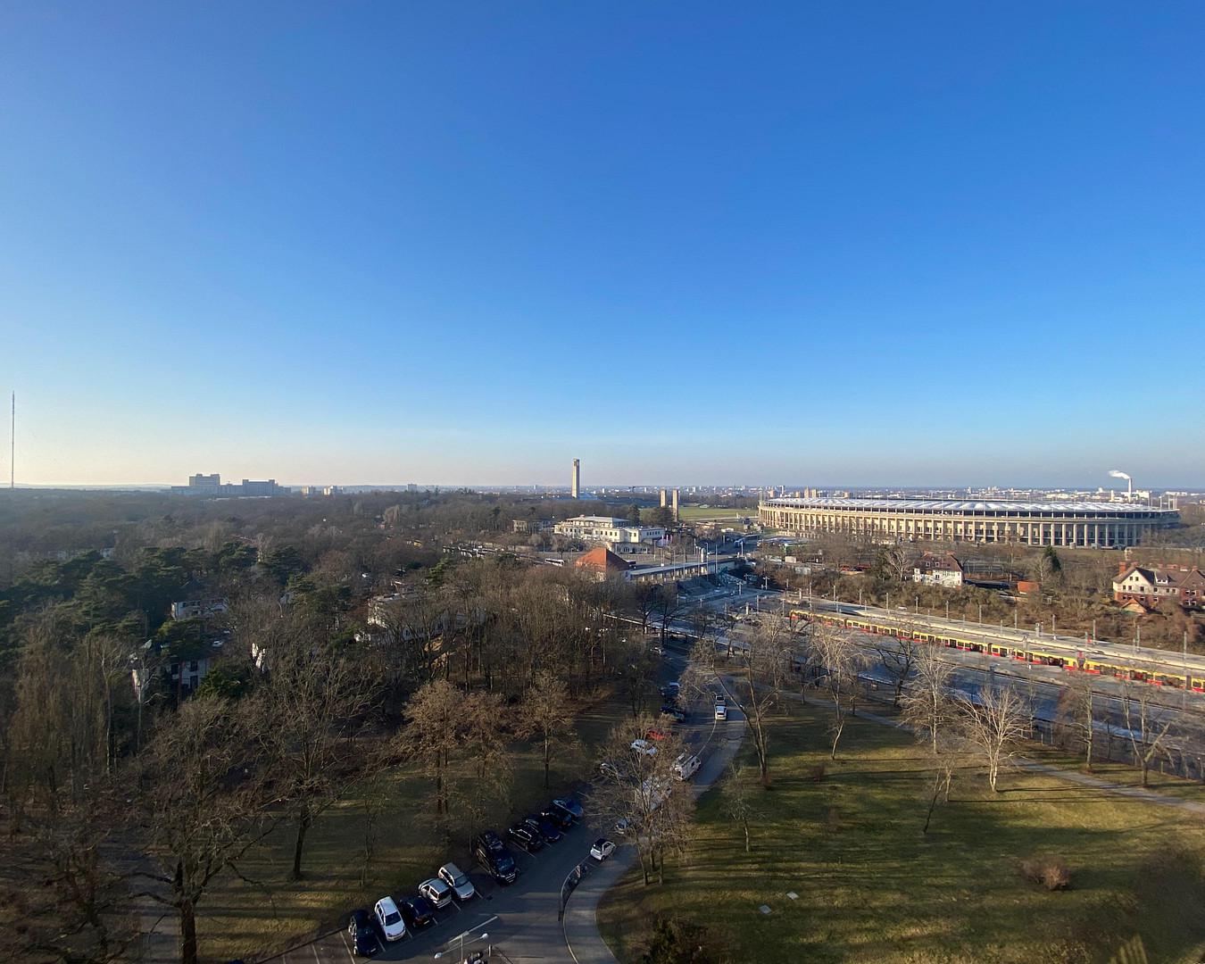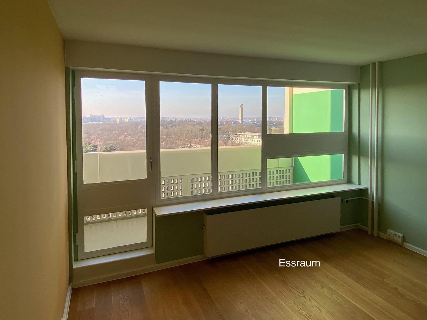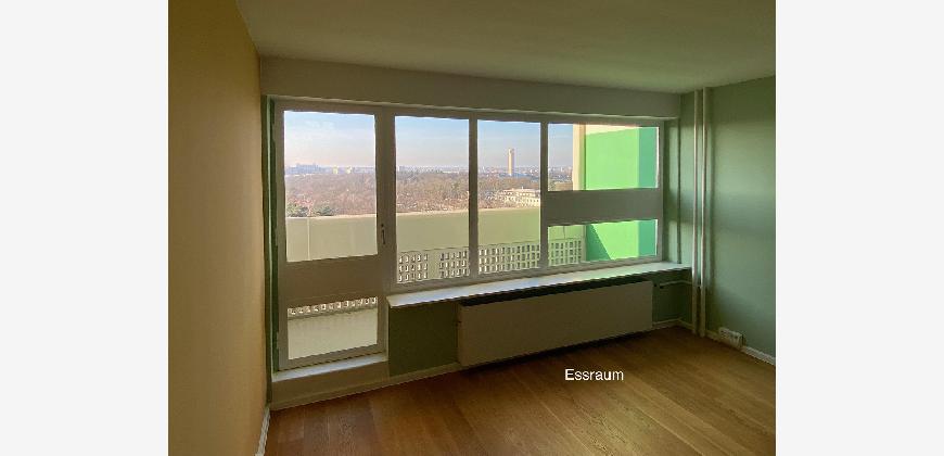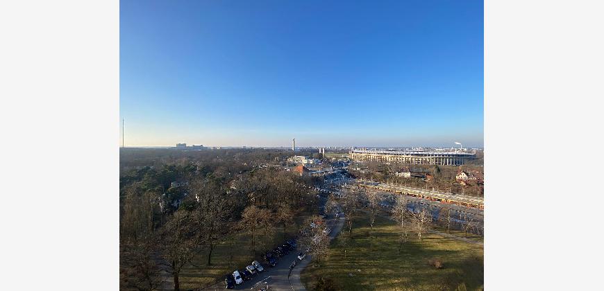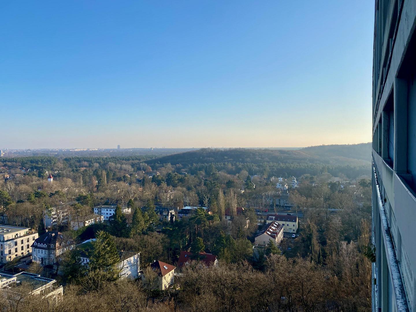 Aus der Höhe der Wohnung öffnen sich über die Balkone Panoramablicke nach Westen über den Grunewald und nach Osten über Berlin.