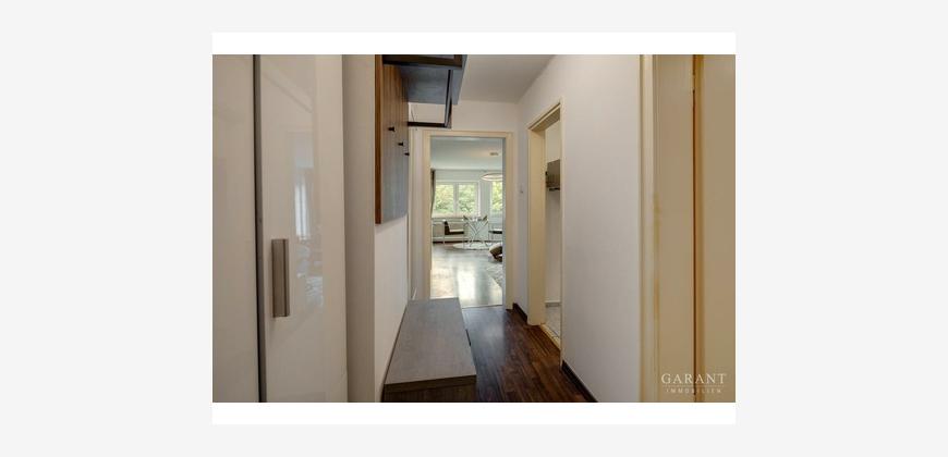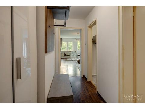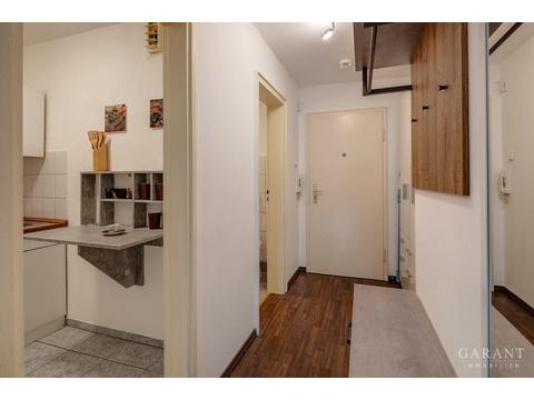 Die Wohnung liegt im 5. Stock mit Aufzug (oberste Etage) und überzeugt durch einen gut durchdachten Grundriss. Besonders hervorzuheben ist die separate Küche, eine echtes Plus bei dieser Wohnungsgröße. Große Fensterflächen sorgen für viel Tageslicht und eine helle, freundliche Atmosphäre mit Blick ins Grüne.