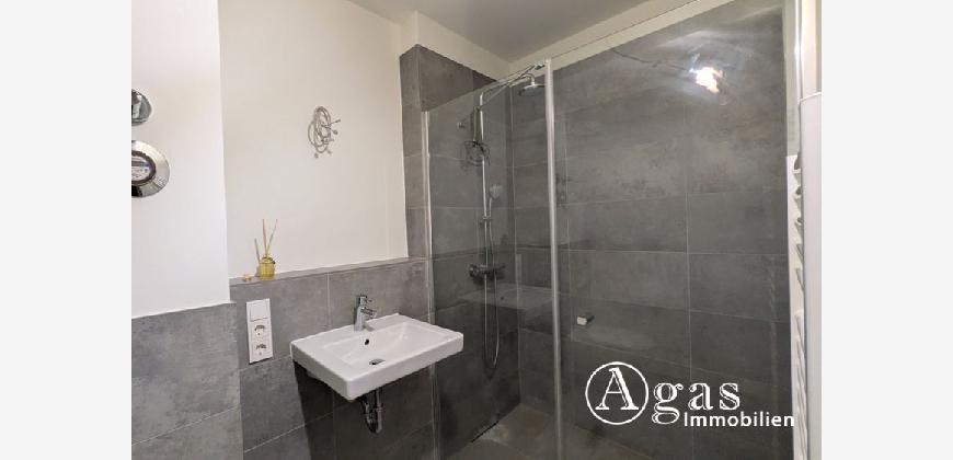 Beim Betreten der Wohnung befindet sich auf der linken Seite Platz für Garderobe und Abstellmöglichkeiten. Direkt rechts liegt das moderne Badezimmer, das mit einer großzügigen Dusche ausgestattet ist.
