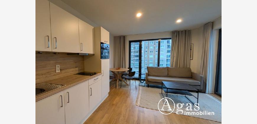 Geradeaus von der Wohnungstür öffnet sich der großzügige Wohnraum, in dem Bett, Einbauküche, Sofa sowie eine Sitzecke harmonisch integriert sind. Bodentiefe Fenster sorgen für eine helle Atmosphäre und bieten Zugang zum Balkon.