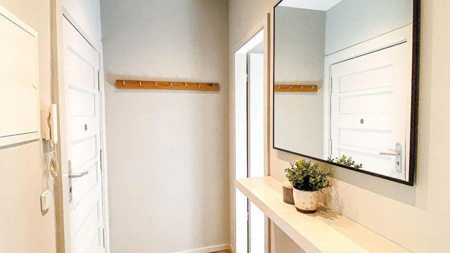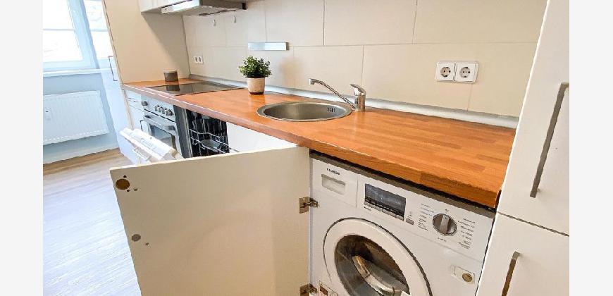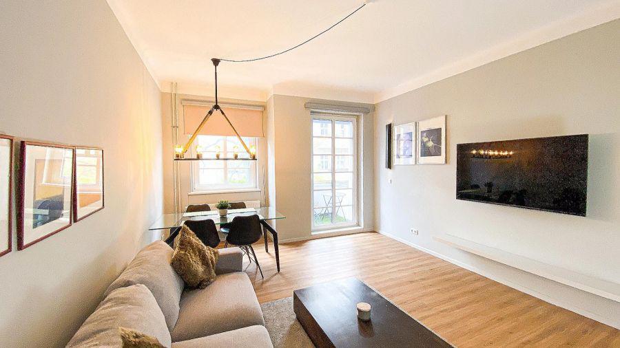 Charmant geschnitten verfügt diese Wohnung über einen hellen Wohnbereich mit allem, was man braucht - liebevoll mit einem Sofa, TV Set und Esstisch eingerichtet. Das Apartment punktet mit einem Balkon am Wohnzimmer.