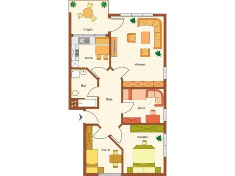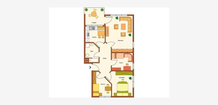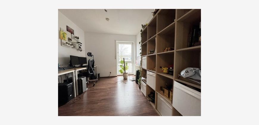 Die Wohnfläche auf ca. 93m² verteilt sich auf ein helles Wohn- und Esszimmer mit direktem Zugang zum Balkon, eine Küche mit Essplatz, eine Diele, ein Schlafzimmer, ein Kinderzimmer, ein Arbeits- bzw. Gästezimmer sowie ein Badezimmer mit Wanne, Dusche und WC.