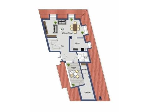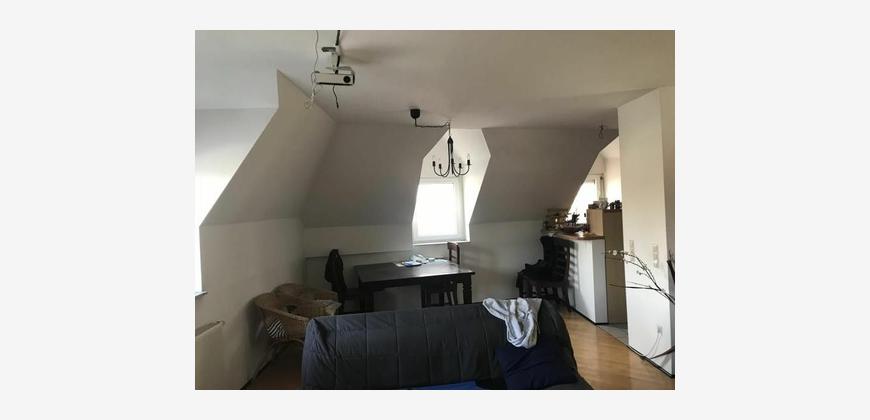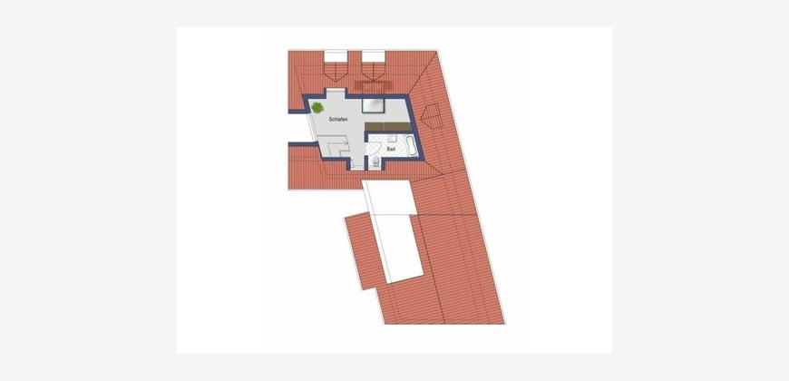 Die Maisonette-Wohnung ist sehr großzügig geschnitten, die Grundfläche ist dabei wesentlich größer als die offizielle Wohnfläche. Die zahlreiche Dachgauben bilden einen Kontrast zu den gemütlichen Dachschrägen.