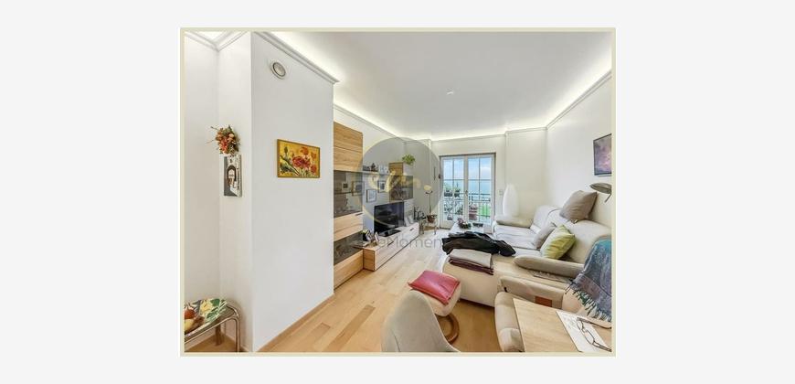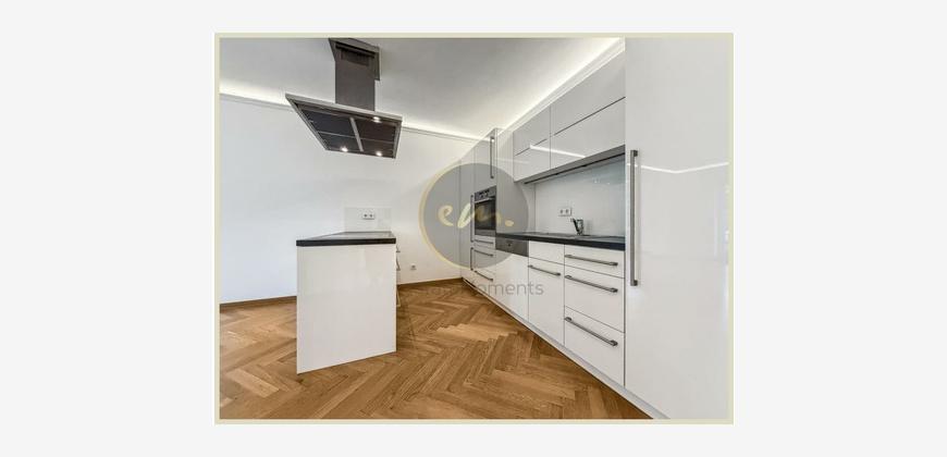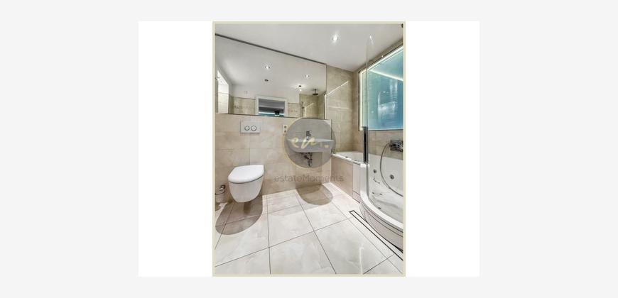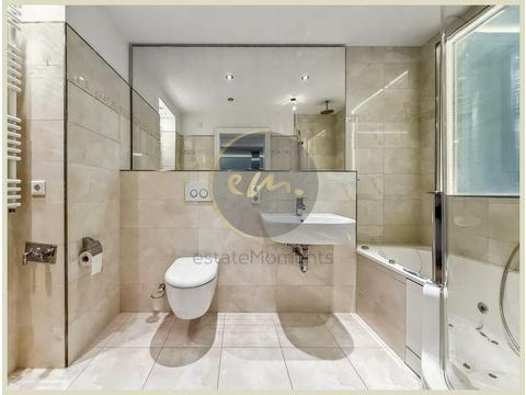Die Wohnung ist mit hochwertigem Parkett ausgestattet, zusätzlich sorgt indirekte Deckenbeleuchtung in Wohn-, Schlaf- und Küchenbereichen für ein stimmungsvolles Ambiente. Die offene Küche ist zweckmäßig geschnitten und lässt sich perfekt in das Wohnkonzept integrieren.