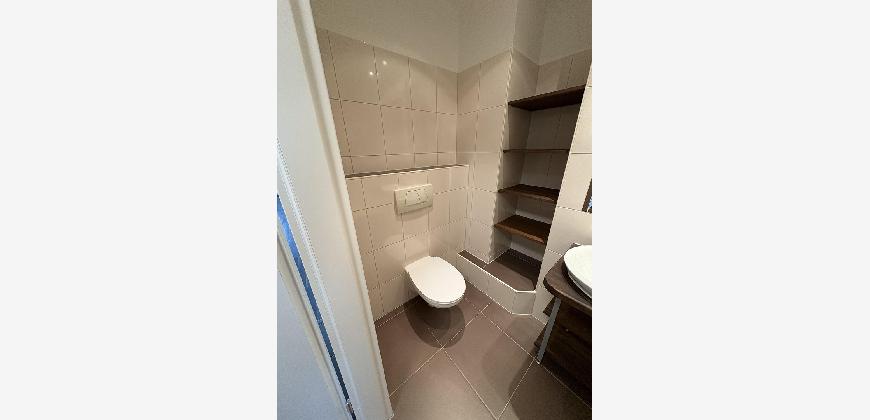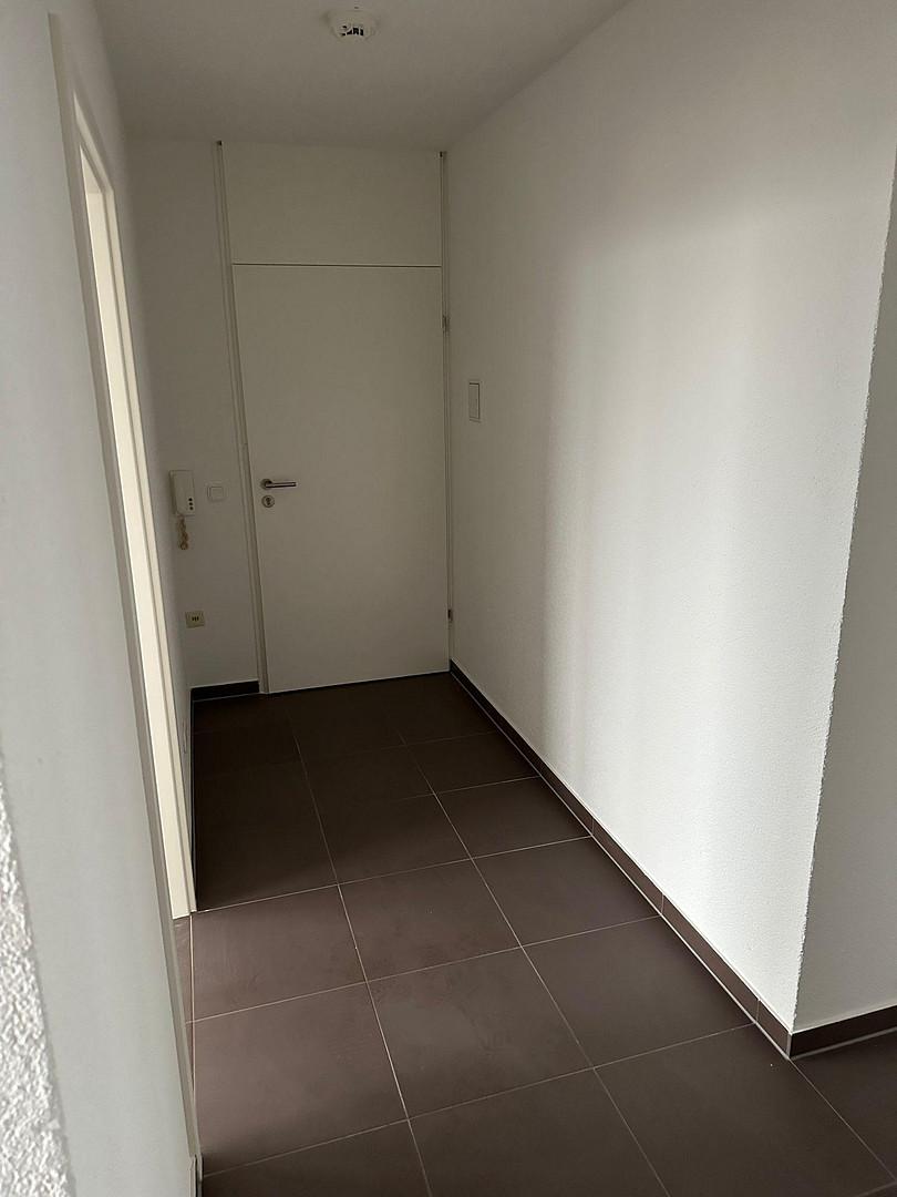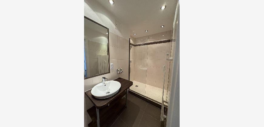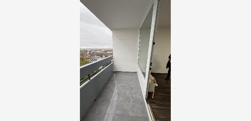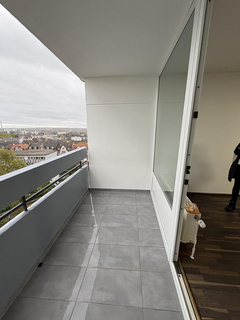 Beim Betreten der Wohnung werden Sie von einem großzügigen Flur mit zeitlosen, dunklen Fliesen empfangen, die sich harmonisch in die Küche und das Badezimmer fortsetzen. Das Herzstück ist das helle Wohnzimmer, welches mit einem hochwertigen Laminatboden in warmer, dunkler Parkett-Optik ausgestattet ist. Von hier aus haben Sie direkten Zugang zur Loggia, die den Blick weit über das Stadtgebiet freigibt. Die separate Küche verfügt bereits über eine gepflegte Einbauküche inklusive Herd und Backofen. Besonders praktisch ist der direkt in die Küchenzeile integrierte Waschmaschinenanschluss. Das Badezimmer wurde mit viel Liebe zum Detail modernisiert und bietet eine bodengleiche Dusche mit Glasabtrennung sowie ein Aufsatzwaschbecken auf einer dunklen Konsole. Passende Regalnischen sorgen für reichlich Stauraum.