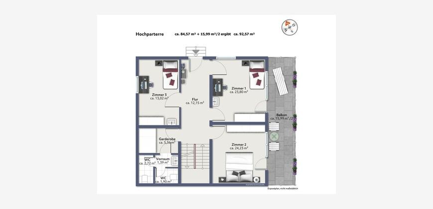 AusstattungGroßzügiger Balkon, Sauna, Laminatböden, bodentiefe Fenster, eigener Eingang.