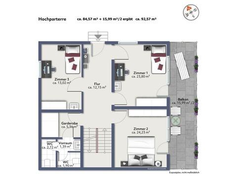 Die Wohnflächen wurde unter Berücksichtigung der DIN277 kalkuliert, wobei konkret im UG die beiden Hobbyräume zu 100% angesetzt wurden, während alle weiteren Räumlichkeiten gar nicht, bzw. lediglich als Nutzfläche berücksichtigt wurden.
