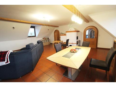 Das Wohnzimmer bietet auf ca. 50 m² ausreicht Platz für den Wohn- und Essbereich. Ein geschmackvoller Kachelofen ist hier das Highlite.